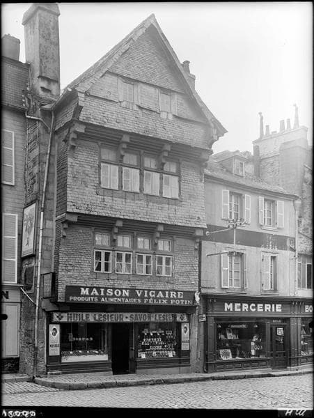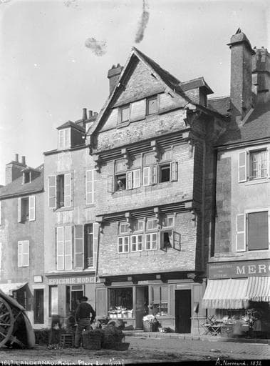 Ancienne maison à pignon sur rue, avec façade en pans de bois recouverts d'ardoises formant encorbellement à chaque étage. Cette maison n'a pratiquement pas été modifiée depuis sa construction, sinon au rez-de-chaussée pour agrandir la baie de la boutique. Les fenêtres du premier étage possèdent encore leurs volets intérieurs en bois à coulisses verticales. La façade postérieure est également en pans de bois.