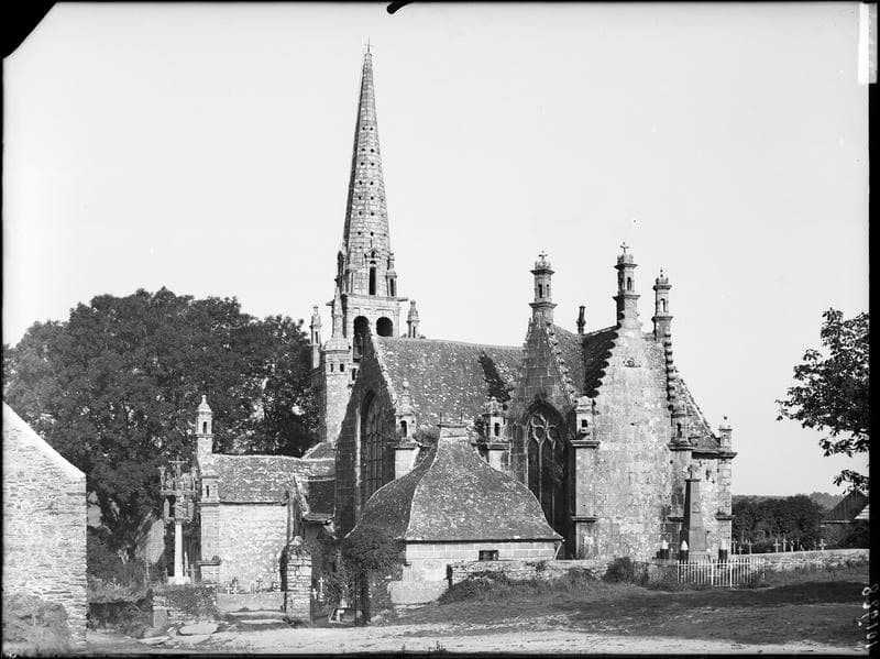 Edifice du début du 17e siècle, comprenant une nef flanquée de bas-côtés, et une abside polygonale dont chaque face est couronnée d'un grand pignon. Le transept est éclairé par deux grandes baies à meneaux. Sur la façade occidentale s'élève le clocher à galerie, terminé par une flèche en pierre élancée. L'édifice s'élève au centre d'un enclos regroupant la sacristie, l'ossuaire et le calvaire.