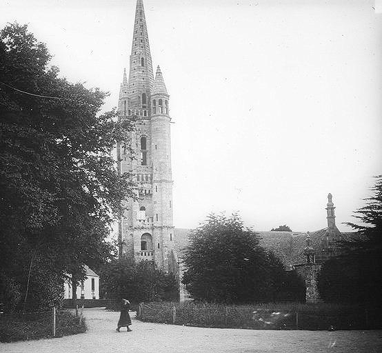 L'église est formée de deux nefs accolées sur lesquelles s'ouvrent des chapelles. L'édifice date en grande partie du 16e siècle. Le clocher date de 1582. La croix se trouvait à l'origine contre le mur d'une propriété dans le bourg. Elle pourrait dater de l'époque carolingienne. C'est une croix de granit monolithe, de forme latine à bras pattés. Le fût est de section rectangulaire et s'amincit vers le haut. Les seuls signes présents sont deux cavités circulaires, l'une au coeur du croisillon, l'autre à la base du fût. Le socle est constitué d'un bloc en forme de meule.