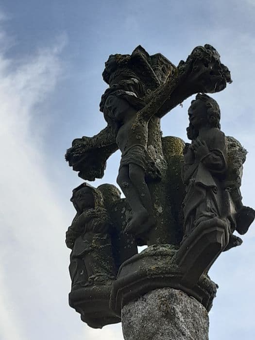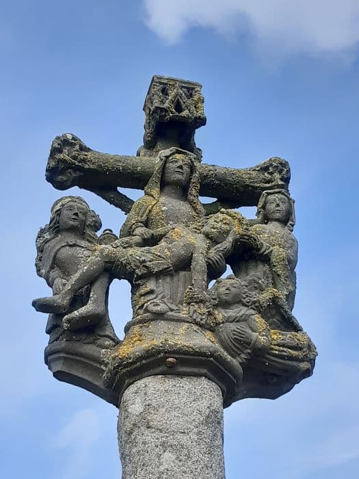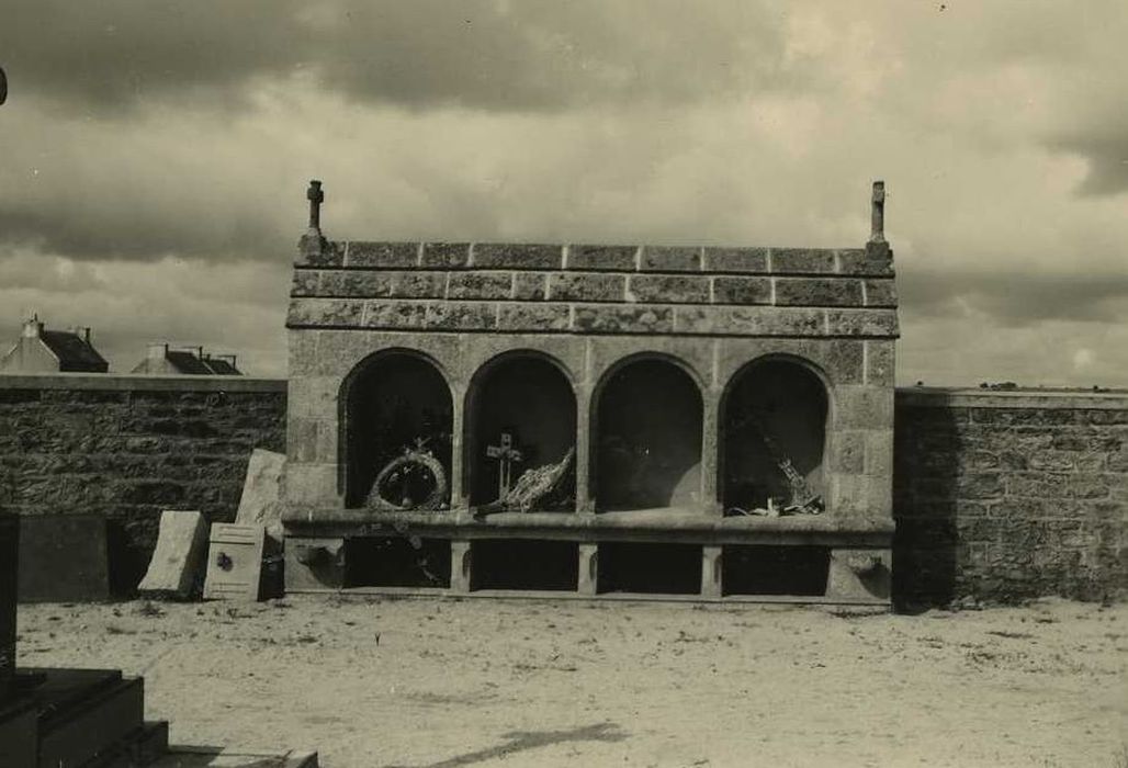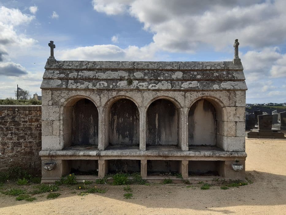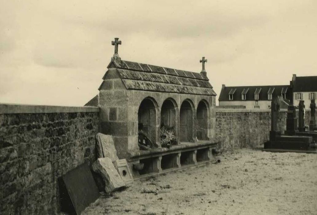 Le calvaire gothique se compose de deux gradins carrés supportant le socle dont les arêtes supérieures sont abattues par quatre motifs en acanthe qui déterminent au sommet une section octogonale. La base et le sommet du fût sont carrés, le reste circulaire. A l'avers se trouvent le Christ entre la Vierge et Saint-Jean. Au sommet du croisillon, un ange se penche vers la tête du Christ. Au revers est représentée la Vierge de douleur entre deux saintes femmes. Le corps du Christ est à demi allongé sur les genoux de la Vierge, et soutenu par les trois femmes. Un ange lui tient le poignet gauche. La Pietà est abritée par un dais à pinacles et crochets. L'ossuaire du 18e siècle est, pour sa part, très représentatif de ce type d'ouvrage dans le Léon, à cette période. L'édifice possède quatre niches voûtées en plein cintre. Une tablette en granit, sur laquelle reposaient primitivement les petites châsses en bois contenant le chef des défunts après exhumation, court d'un bout à l'autre de l'ossuaire. Deux croix en granit surmontent le faîtage en ses extrémités.