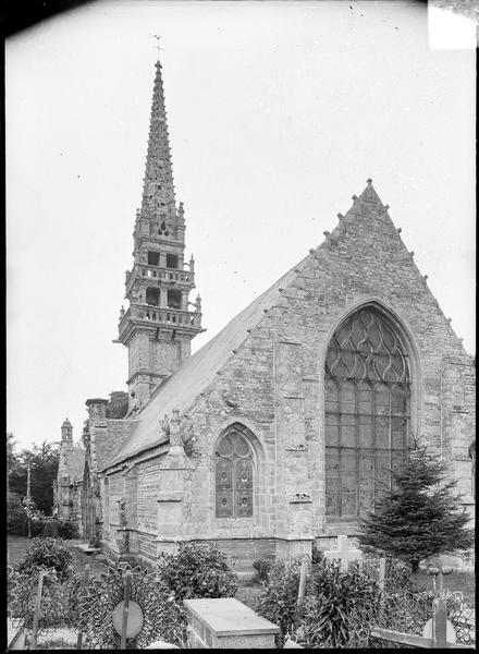 L'église à trois nefs est couverte par un berceau en bois, la voûte de la nef centrale et du choeur ayant conservé ses peintures. Le jubé s'appuie sur les piliers du choeur et se prolonge, sur ces piliers, par deux dais abritant des statues. Les murs de la nef sont montés en monolithes de schiste ardoisier. La chapelle funéraire, de 1639, se développe parallèlement à la façade occidentale de l'église. C'est une oeuvre du 17e siècle ayant toutes les caractéristiques du 16e.