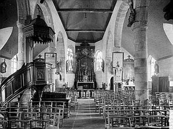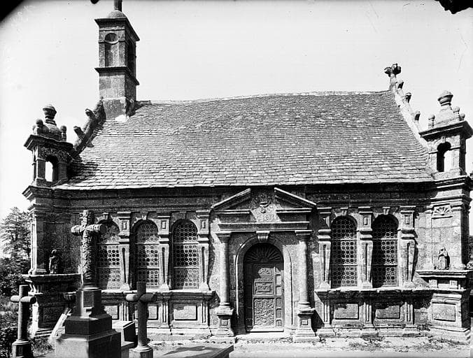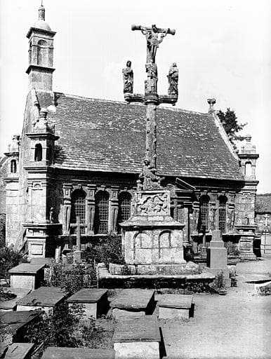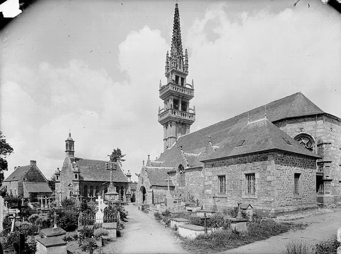 Abside datée de 1688. Le clocher, du type des clochers à jour à étage du Léon, est formé aux deux étages du beffroi par des piles parallèles de granit entre lesquelles oscillent les cloches. Les étages sont constitués de galeries en encorbellement.