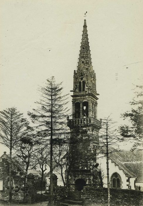 L'église, qui semble avoir conservé des éléments du 15e siècle, a été agrandie au siècle suivant (porche méridional refait et construction du transept). Le clocher a été reconstruit au début du 18e siècle. L'ossuaire s'ouvre par des arcades qui, en s'entrecoupant, dessinent des arcades secondaires, plus petites, en tiers point, décorées de redents. Le calvaire est monté sur un socle octogonal que ceint un bandeau feuillagé et présente une tige à torsade et quatre culs de lampe.