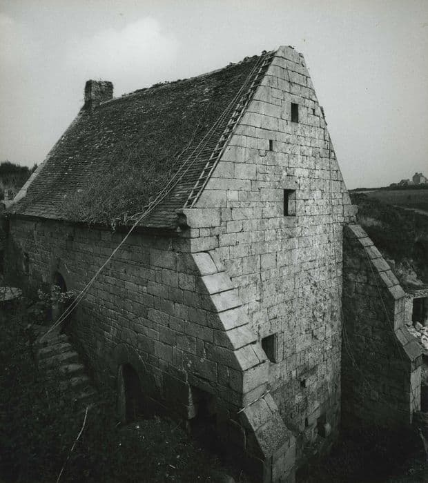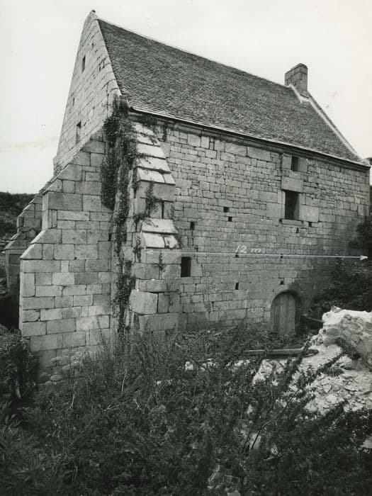 Présumé du 17e siècle, ce moulin relevait d'un manoir mentionné au 16e siècle, dont il tient encore le nom. Sa masse architecturale paraît antérieure et mal s'accorder avec le chronogramme conservé (1765). D'une sobriété et d'une robustesse remarquées par les grands écrivains voyageurs (Flaubert, Daudet) , son plan est rectangulaire. Ses doubles contreforts, de type finistérien, et les murs en blocage, en gros appareil de granit, sont posés à joint vif. La roue verticale, démontée peu après l'arrêt du moulin, en 1905, avait 5, 50 m de diamètre, l'arbre moteur traversait le mur pignon pour entraîner les mécanismes, depuis supprimés, mais des textes mentionnent que ce moulin, plus qu'exigu, fut équipé de deux tournants, dont l'un actionnait une meule auxiliaire écrasant le blé noir.