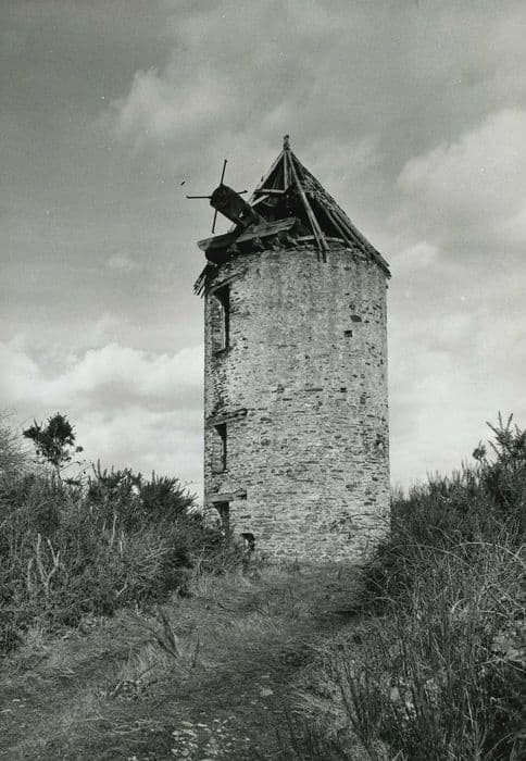 Antérieur à la réalisation du cadastre (1837) , ce moulin à vent de type tour occupe le sommet isolé d'une colline (cote 73) et dresse son mur circulaire (hauteur 7, 95 m) sur trois niveaux d'ouverture à linteaux de bois. Fait de schiste et de grès jointoyé de mortier, l'édifice est desservi par un escalier tournant, au premier étage, puis par une échelle meunière, au second. Privé aujourd'hui de ses ailes et de ses meules, il avait été équipé du système Berton à une date indéterminée.