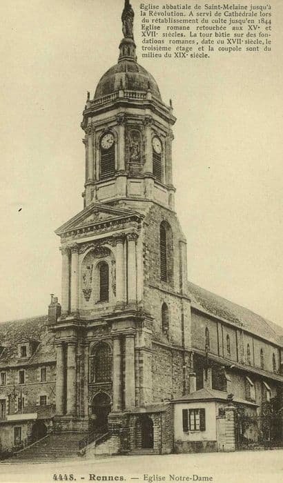 L'abbaye, dont la fondation remonte au 6e siècle, est la plus ancienne du département et l'une des plus importantes de l'ouest de la France entre le 11e siècle et la Révolution. Cette longue histoire, qui débute à proximité du lieu de sépulture de Mélaine, ancien évêque de Rennes, est marquée notamment par l'oeuvre des Bénédictins à partir de 1030 et des Mauristes au 17e siècle. Les témoignages architecturaux qui subsistent aujourd'hui sont principalement l'aile ouest des bâtiments conventuels qui abrita un hôpital de 1793 à 1939 ; une galerie du cloître mauriste adossée à l'édifice précédent ; l'ancien logis abbatial devenu palais épiscopal au 18e siècle puis bâtiment administratif à partir de 1905 ; l'église, édifice complexe représentant un concentré d'évolution architecturale depuis le haut Moyen Age jusqu'au 19e siècle.
