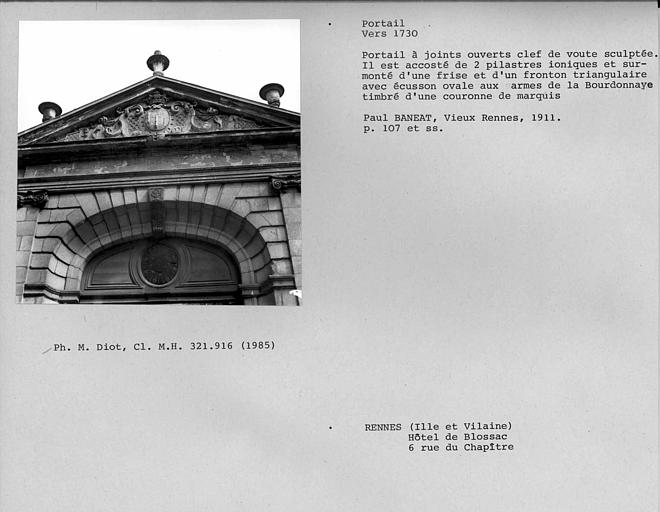 Edifice construit en 1730 et 1750 par le comte de la Bourdonnaye-Blossac, en englobant l'ancien hôtel de Brie datant du 17e siècle. Dès son édification, le bâtiment fut loué par la communauté de ville pour servir d'habitation au commandant en chef de la province de Bretagne, de 1732 à 1789. Pendant l'époque révolutionnaire, l'hôtel est le théâtre de manifestations populaires. Après la Révolution, l'hôtel fut loué à divers particuliers. L'écrivain Paul Féval y naquit en 1816. L'hôtel est l'une des oeuvres les plus représentatives de l'architecture du 18e siècle à Rennes.