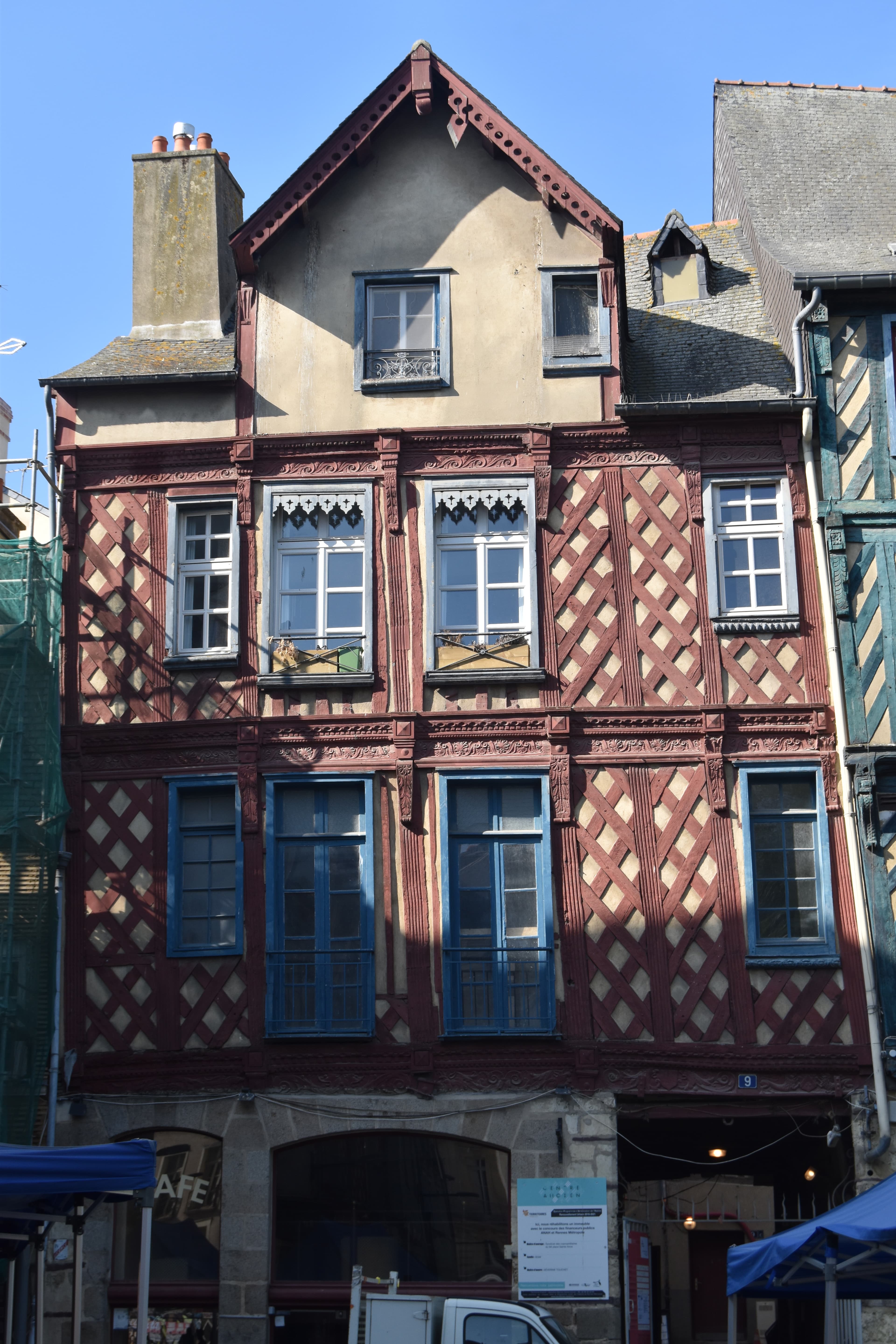 Maison connue dès 1687 sous l'appellation hôtel de Bretagne. Les Bretagne étaient des bourgeois de Rennes. Auparavant, elle portait le nom de Rat Vizé. L'édifice se compose d'un rez-de-chaussée et de deux étages. Au-dessus du rez-de-chaussée s'étend une double ligne de poutres apparentes sculptées. La ligne inférieure est divisée en quatre panneaux. Les trois premiers figurent des rinceaux Renaissance ; le dernier représente deux écussons en accolade, dont l'un porte la date de 1586.