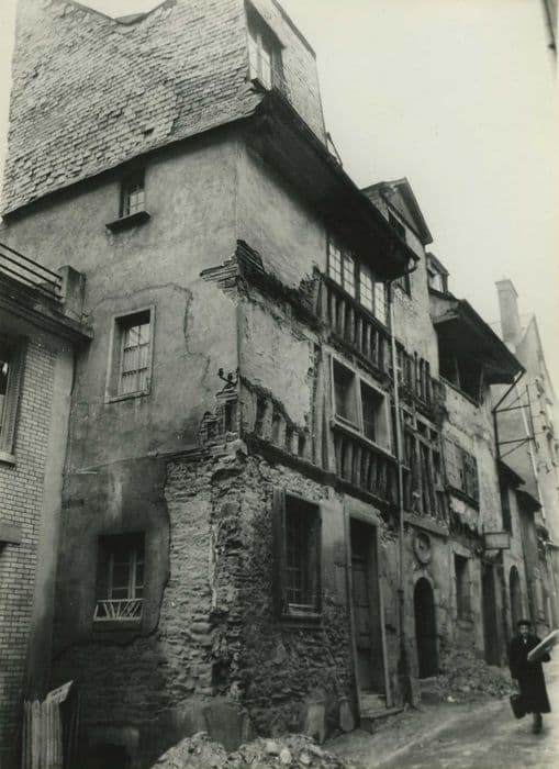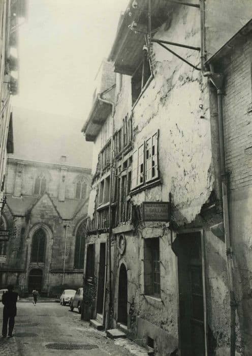 Maison à pans de bois, remontant au 15e siècle (mentionnée en 1461) , présentant une petite porte sous plein cintre surmontée d'un oculus bouché, des avant-soliers décorés, une série de fenêtres à petits carreaux, et une haute toiture irrégulière à coyaux. Deux étages s'avancent légèrement en encorbellement. Celui du premier étage a été supprimé par l'adjonction d'un mur bâti sur le même plan vertical.