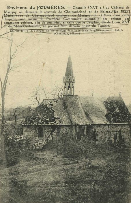 Cette chapelle à abside du 16e siècle dépendait du château de Marigny et conserve le souvenir de Chateaubriand, ainsi que de Balzac venu chez le général de Pommereul en 1828 afin de se documenter pour son roman "Les Chouans".
