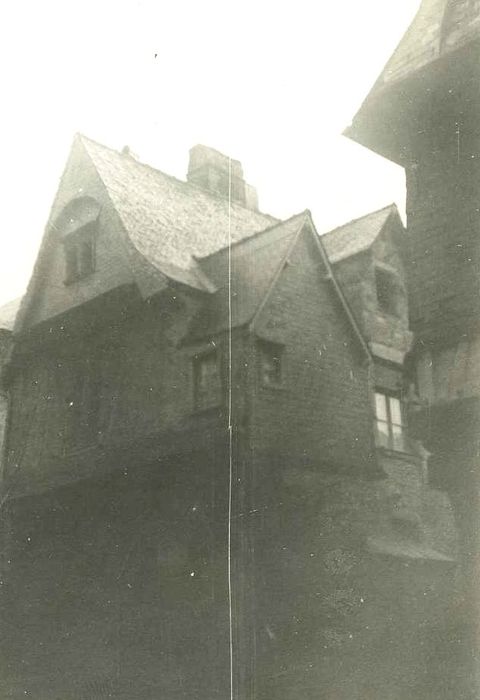 Maison datée de 1602, présentant un rez-de-chaussée en maçonnerie, un étage en pan de bois monté sur poutres moulurées, et des pignons couverts d'ardoises.