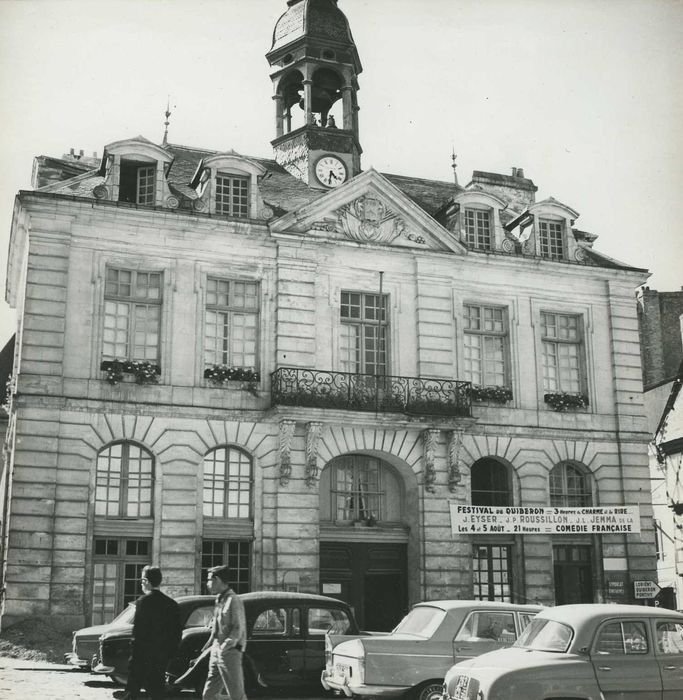 L'hôtel de ville a été construit pour s'adosser aux halles de bois surmontées de l'auditoire de la sénéchaussée, aujourd'hui disparues. Les plans de 1772 seraient de M. de Saint-Pierre, ingénieur du Roi et de la Compagnie des Indes à Lorient, repris en 1775 par Detaille de Kerroyant et exécutés de 1776 à 1782 en pierre de Taillebourg.