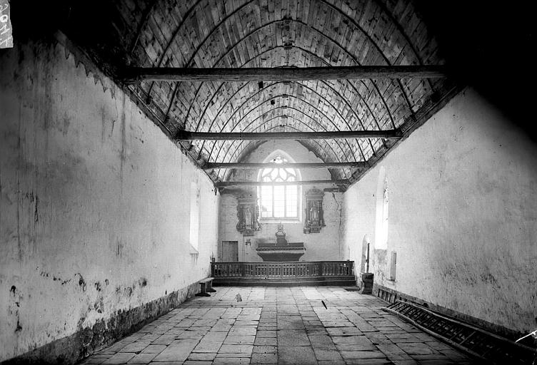Une première étape de construction de l'édifice s'achève en 1488, comme en témoigne l'inscription sculptée sur une sablière. De plan rectangulaire allongé, elle conserve de cette époque toute la partie orientale avec sa fenêtre de chevet de style flamboyant, et, au sud, une porte en anse de panier dont l'accolade s'appuie sur des culots sculptés. Le reste de l'édifice date d'une phase de reconstruction au 16e siècle. Sa façade occidentale est ornée d'un portail qui enveloppe, dans un grand arc brisé à retraites, deux portes géminées en anse de panier dont les accolades s'appliquent sur le tympan.