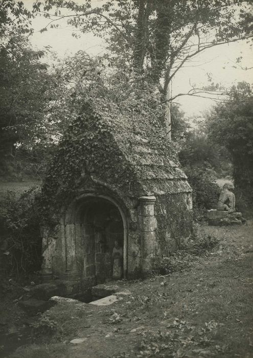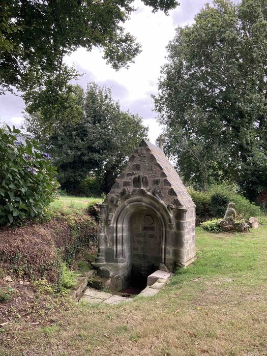 Autour de cette fontaine se tenait le "Pardon aux chevaux" qui attirait les cultivateurs de la région. L'ouvrage présente une niche en anse de panier dans un massif de maçonnerie sur plan rectangulaire. En façade, colonnes sur l'angle, sans amortissement. Accolade d'accompagnement avec éléments gothique ou Renaissance. Dans le fond, une autre petite niche est surmontée d'une coquille. Cul de lampe à ornementation Renaissance supportant une statue en bois. La descente à la piscine s'effectue par le côté avant. La vieille chapelle voisine a été démolie et certains éléments remployés. Il en reste une gargouille juchée sur un dais du 16e siècle.