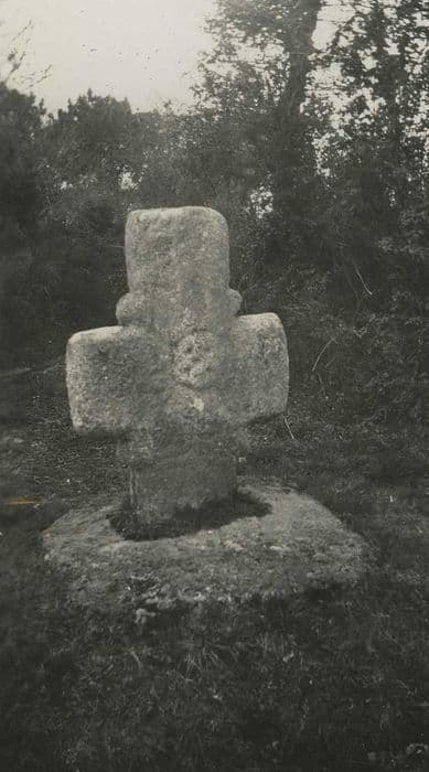 Croix d'environ un mètre dont le pied, réduit de hauteur, est fiché dans un dé rectangulaire. Renflement ou motif arrondi aux aisselles. A l'intersection des bras, cinq trous sont inscrits dans un cercle gravé.
