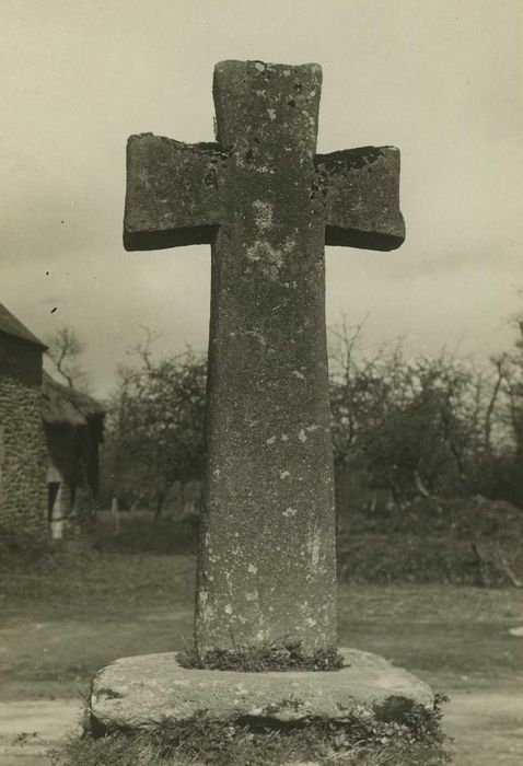 Croix de chemin en pierre monolithe à bras pattés, du 11e ou 12e siècle.