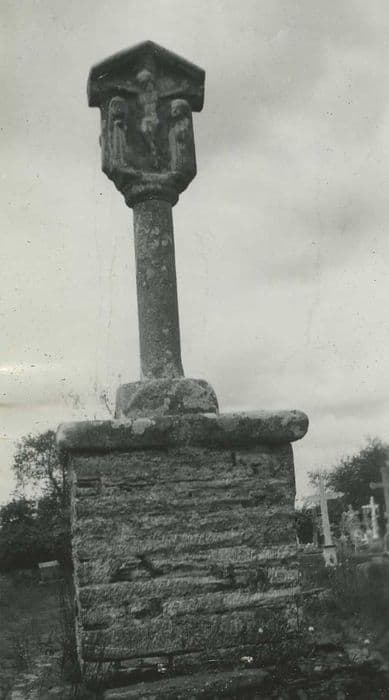 Croix portant, d'un côté le Christ, la Vierge et Saint-Jean ; de l'autre une Pietà. Le tout est surmonté d'un fronton rectiligne sans ornementation.