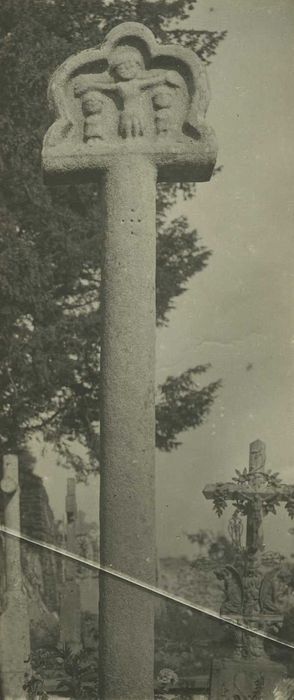 Croix en granit présentant un fût rond percé de cinq trous, se terminant en forme de tour, surmonté d'un médaillon polylobé avec représentation de la crucifixion sur une face, et d'un chevalier entre deux croix sur l'autre.