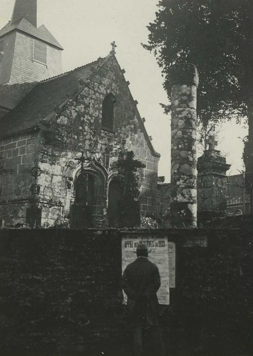 La colonne se trouvait autrefois face au portail de l'église. Haute de 3m50, large de 1m70, elle porte un écusson aux armes des Trégranteur.