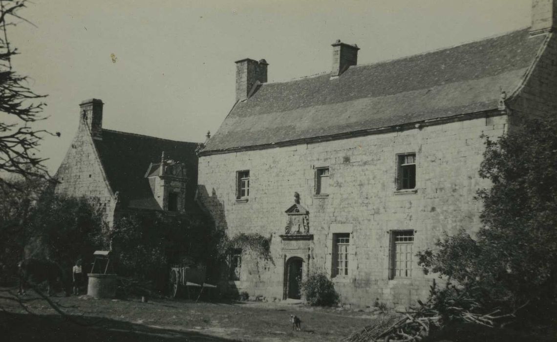 La construction paraît remonter au 15e ou 16e siècle, d'après le style des cheminées. Il semble que la porte d'entrée et la lucarne de l'aile ouest soient des adjonctions postérieures. Les armoiries que portait le blason de cette porte ne sont plus lisibles. Tout autour du manoir s'élevait une enceinte fortifiée dont il subsiste une tour à l'est et un portail ruiné datant de 1620. La petite porte piétonne a été conservée. A l'angle nord de l'enceinte, chapelle en ruine. Le manoir a appartenu à la duchesse d'Elbeuf et aux de Kerangal.