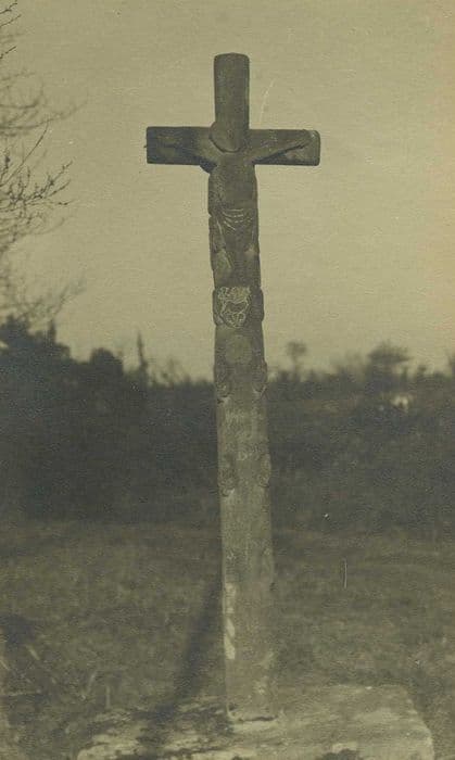 Croix monolithe armoriée. Le Christ sur la croix doit être la reproduction d'un Christ plus ancien. Sous ses pieds se trouve l'écu armorié. Fût avec feuillage sculpté.