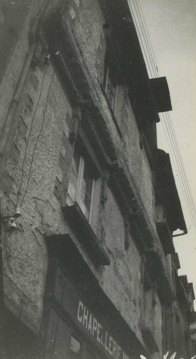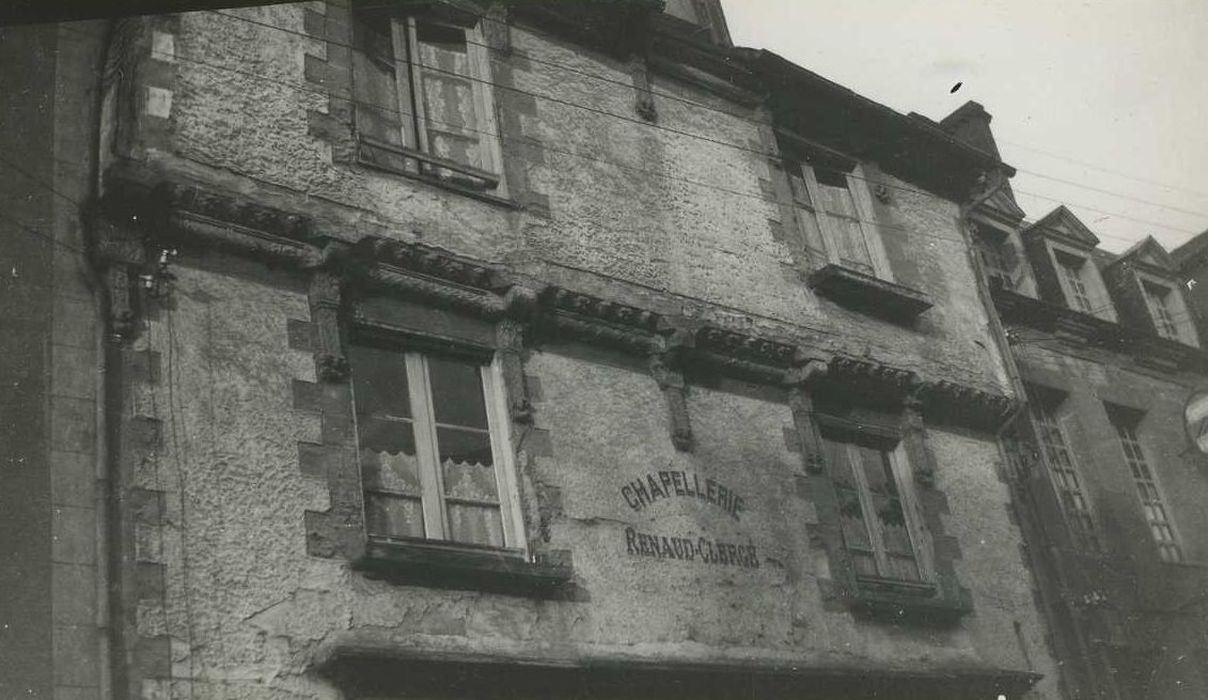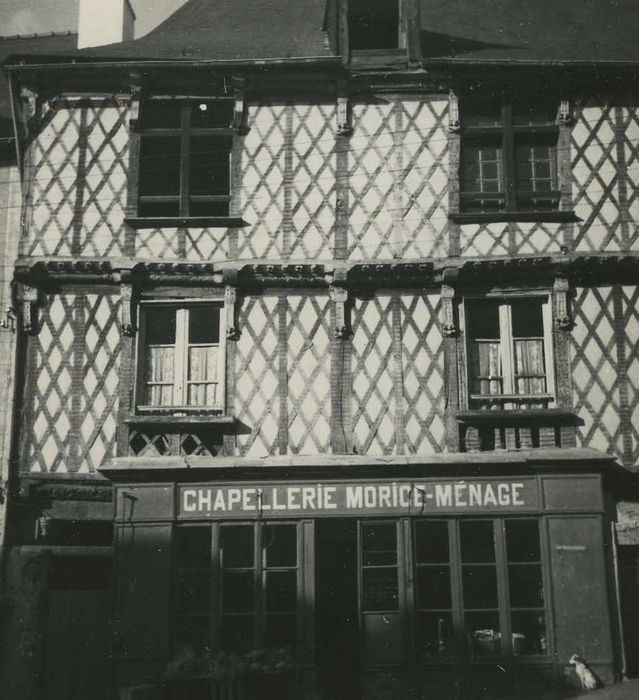 Façade à deux étages de pans de bois en encorbellements successifs qui reposaient autrefois sur une galerie formant portique au rez-de-chaussée. Ce dernier a été supprimé et remplacé par une boutique avec devanture en menuiserie. Les pans de bois étaient couverts par un enduit avec imitation de harpes en pierre autour des fenêtres et aux angles. Les sablières du rez-de-chaussée sont sculptées, comme celles des étages supérieurs et la poutre maîtresse du portique qui repose sur un pilier circulaire en granit avec chapiteau orné d'un écusson.