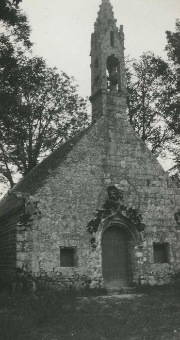 Chapelle rectangulaire. Le pignon du clocher s'ouvre par une porte avec accolade circulaire. Fleurons amortissements en gargouilles. Petit clocheton à jour en granit.