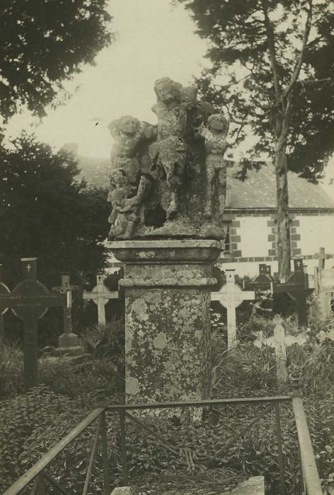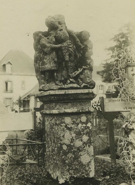 Restes de calvaire en granit, sculpté en haut relief. Sur une face, le Christ en croix entre les deux larrons et Longus tenant le fer de sa lance ; sur l'autre, représentation de la descente de croix.