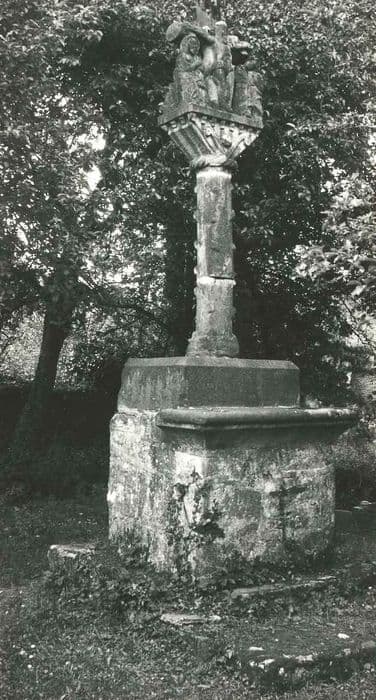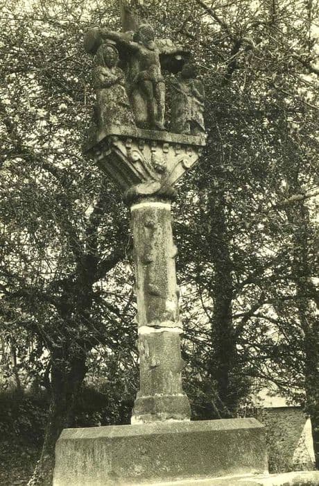 Représentation du Christ en croix entre la Vierge et Saint-Jean. Statuettes sur socle sculpté se reliant par un noeud en forme de câble à un fût écotté et diminué dans sa hauteur.