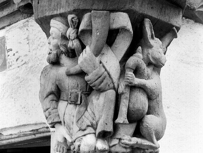 Maison à pans de bois ornée de sculptures sur bois représentant des grotesques.