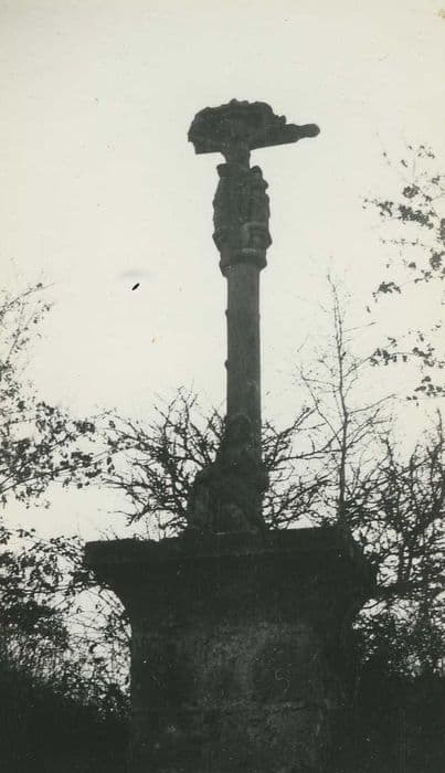 Calvaire formé par un Christ entre la Vierge et Saint-Jean. Une Vierge à l'Enfant est représenté au verso. Une accolade couronne la croix dont les bras ont une largeur inaccoutumée. Le fût est moderne, reposant sur un soubassement, une Pietà dont le Christ est sans tête.
