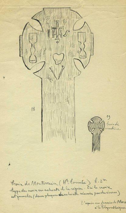Croix située sur le chemin de la chapelle, à Haute-Touche. C'est une croix plate à bras pattés, en schiste, avec des figures gravées. Elle est constituée par deux plaques de schiste appliquées l'une contre l'autre. Les gravures représentent le monogramme du Christ, deux calices, un coeur, deux clous.