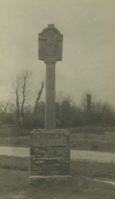 Croix à bannière en granit sculpté. Sur la face antérieure, le Christ en croix entre la Vierge et Saint-Jean. Sur la face postérieure, Vierge à l'Enfant entre donateurs.