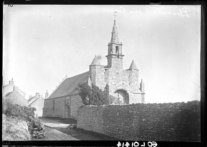 Edifice rectangulaire voûté en bois. Petit clocher entre deux tourelles trapues, l'une pour l'escalier, l'autre par symétrie. L'entrée principale du pignon se trouve entre deux contreforts se réunissant par une arcade, lui faisant une sorte de niche. Fenêtres à meneaux aux formes Renaissance ou fleur de lysé. Deux portes latérales sont moulurées et accoladées.
