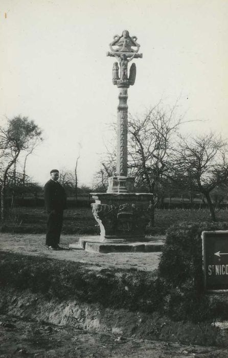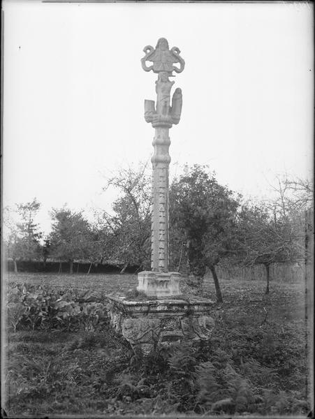 Croix en bordure de chemin, constituée d'un fût traité en colonne corinthienne. Le soubassement est en forme d'autel avec motifs d'angelots ou anges et agneau au centre. Le fût est décoré d'hermines supportant le Christ en croix, encadré de la Vierge et de Saint-Jean. Le Christ est surmonté de Dieu le Père et du Saint-Esprit.