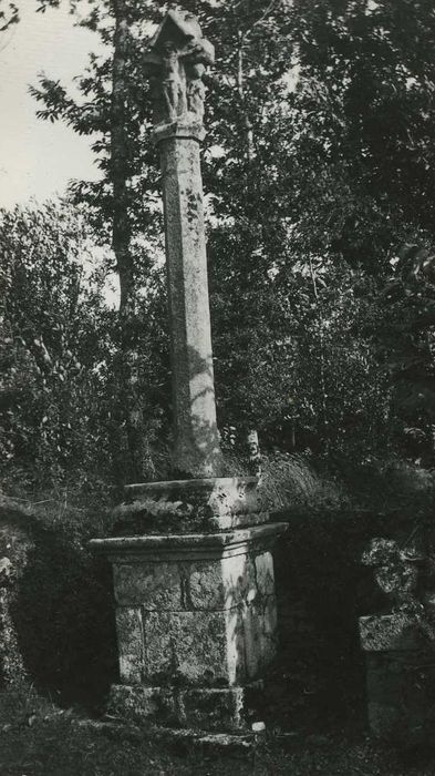 Croix en bordure de la nationale, dans un renfoncement ménagé contre un talus. Fût octogonal élancé, supportant le Christ, la Vierge et Saint-Jean, surmontés d'un petit gâble au fronton aigu.