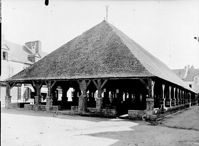 Halles en charpente de chêne datant de 1675, construites sur un plan rectangulaire et mesurant 56m de long sur 15, 50m de large. Elles se composent d'une grande nef de 17 travées, appuyée par deux parties constituant bas-côtés. Tous les poteaux des fermes reposent sur des piedestaux en granit. Ceux en bordure de l'extérieur sont reliés par un muret percé irrégulièrement de passages correspondants aux rues débouchant sur la place.