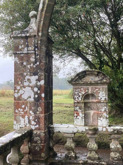 Fontaine de plan carré avec quatre piliers aux angles reliés entre eux par des arceaux de granit. Disposés en diagonale au-dessus de la source. Une balustrade en granit joint ces piliers.