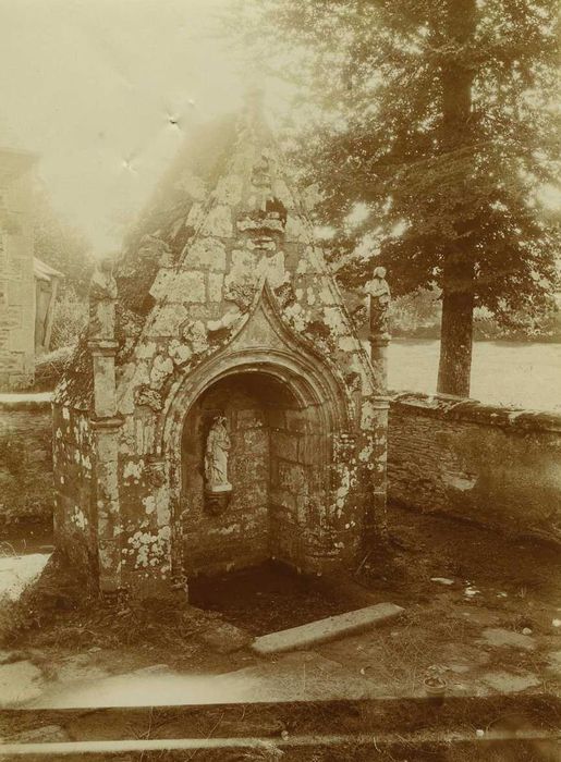 Fontaine date de la fin du 16e siècle, placée face à la ruelle à l'est de l'église. Elle est placée au centre d'un terrain rectangulaire entouré de murs et dont le sol est en contrebas. On y accède par six degrés garnis d'une défense pour les animaux. La fontaine se compose d'une grande niche moulurée en anse de panier, surplombant le bassin de la source, flanquée de deux colonnes d'angle engagées et coiffée d'un toit en granit dont le devant forme gâble avec jolis crochets sculptés. Sur les deux colonnes dépassent le gâble et au sommet de ce dernier embases rondes portant des statues. Dans le fond, niche avec coquille portant une statue de Saint-Julien.