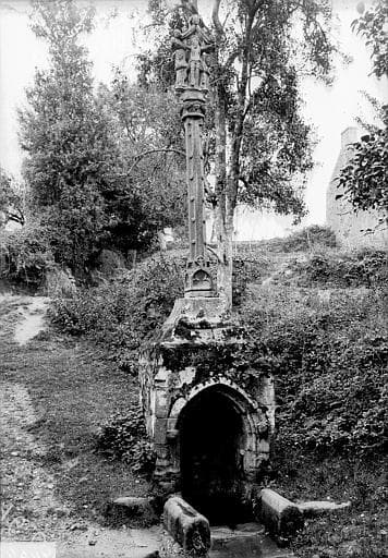 Fontaine surmontée par un calvaire, datant du 15e siècle. Le soubassement cubique comporte une niche flanquée de deux petits contreforts sous laquelle jaillit la source. Dans la niche, statue en bois d'un templier. Au-dessus se trouve le calvaire. Fût octogonal terminé par un chapiteau orné de petites têtes, sur lequel sont posés le Christ et Saint-Jean. Au verso, Vierge à l'Enfant. Le calvaire a conservé une couleur rouge brique provenant d'une peinture ancienne.