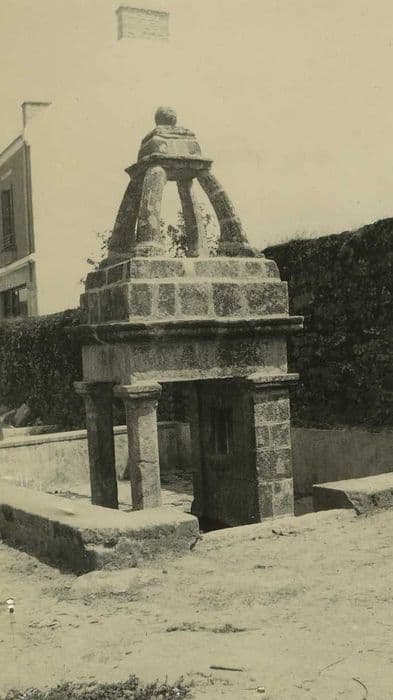 La fontaine, en contrebas de quelques marches, est dominée par un motif : mur de fond et deux piliers doriques supportant un entablement avec baldaquin à quatre branches, le tout en granit. L'ouvrage est situé près de l'église.