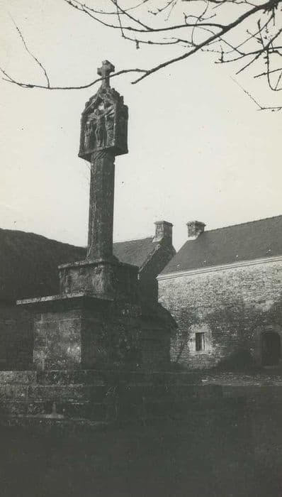 Croix à bannière située près de la chapelle de Saint-Colombier. Base rectangulaire sculptée. Devant est représentée la résurrection encadrée aux angles par un personnage à mitre et un moine. A droite, le Christ descendant aux limbes avec, près de lui, trois évangélistes. A gauche, portement de croix, avec des personnages costumés comme au temps des Valois : Vierge, Symon le Cyrénéen, Christ, deux hommes liés qui pourraient être les larrons, soldat. Derrière, panneau énigmatique avec un moine, trois chevaliers, un personnage à turban. Cette scène est encadrée par un personnage à bonnet pointu et un évangéliste. Le fût ancien a été remplacé par un fût plus lourd. Le tableau supérieur se trouve entre quatre colonnettes dont une a disparu. Sur une face, le Christ en croix entre la Vierge et Saint-Jean ; sur l'autre, la Pietà. Au-dessus, accolades et têtes d'anges surmontées d'une croix.