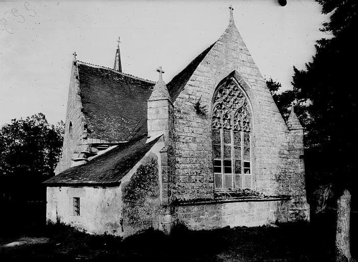 Chapelle composée d'une nef, d'un transept et d'un chevet plat. La façade occidentale est surmontée d'un clocher. A l'intérieur, sablières et entraits sculptés. Vitraux du 16e siècle représentant des scènes du Nouveau Testament.