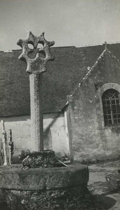 Croix de cimetière présentant quatre feuilles ajourées à lobes légèrement allongés. L'axe de ce motif est disposé en x. L'extrémité des bras de la croix, ainsi que l'intervalle entre eux, se profile par un demi cercle rentrant, donnant à l'ensemble l'aspect d'une sorte de roue dentée. Le raccordement entre la croix et le fût est orné d'un petit Christ de peu de saillie. Fût octogonal applati. La base est cubique et repose sur un massif circulaire. Les tombes de l'église remontant à 1545 peuvent faire supposer que ce calvaire appartient à cette époque.