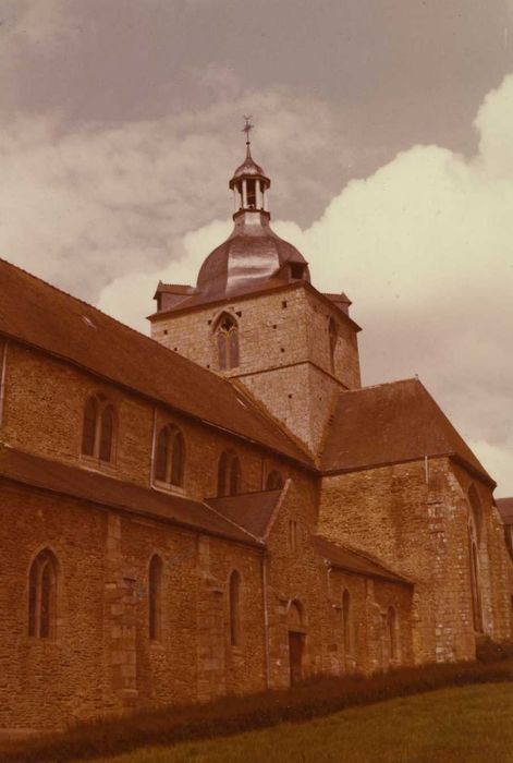 Autrefois au diocèse de Saint-Malo, l'église était le siège d'un prieuré de l'abbaye de Saint-Jacut. L'église est partiellement romane (bas-côté nord, grandes arcades et mus du bas-côté sud). Reconstructions aux 13e, 15e et 18e siècles. L'église comprend une nef de sept travées, avec bas-côtés, un transept et un choeur terminé par un mur rectiligne. Au 13e siècle, ouverture sur le bas-côté nord d'un portail dont l'arc brisé voisine avec l'arc en plein cintre. Au 15e siècle, sur ce même bas-côté nord, fut construite une chapelle précédée d'un porche gothique voûté d'ogives. A la même époque, les arcades du bas-côté sud et celles du carré du transept furent refaites en tiers-point, à double rouleau, ainsi que les colonnes à chapiteaux décorés de feuillages, engagées dans des piliers cylindriques qui les portent. Le choeur, les croisillons et le clocher sur le carré du transept furent refaits de 1742 à 1787. L'église est couverte d'une charpente dont la sablière nord est sculptée de fleurons, de rinceaux et d'anges portant les instruments de la Passion.