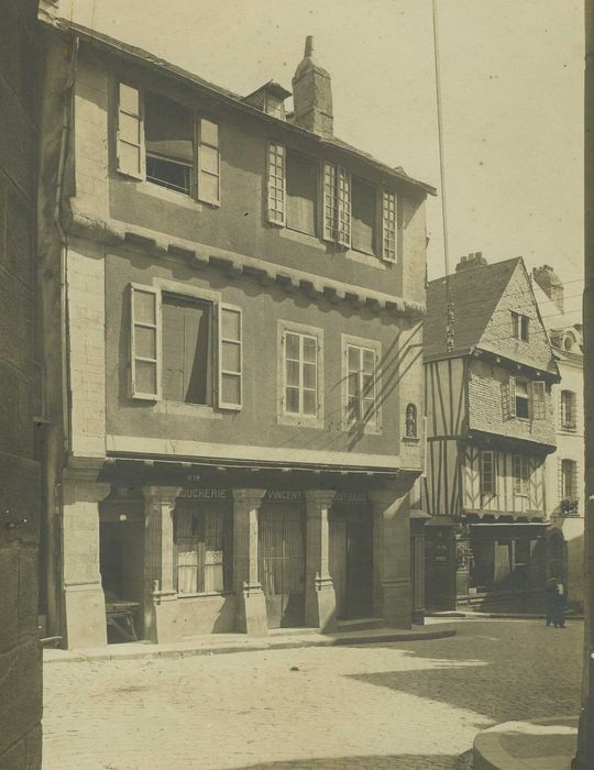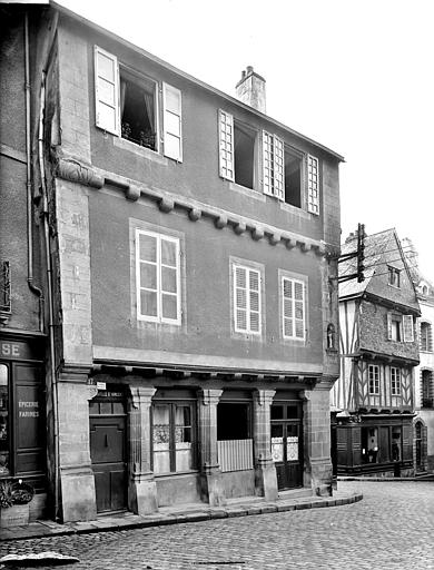 Maison à deux étages surplombant, le premier soutenu par une énorme poutre moulurée et sculptée où figurent une tête d'homme et une de femme, et qui porte la date de 1574. Cette même date se retrouve sur la niche de saint creusée dans le mur latéral droit. Le rez-de-chaussée est constitué par des piliers de granit moulurés. Pierres moulurées et sculptées sur les murs latéraux.