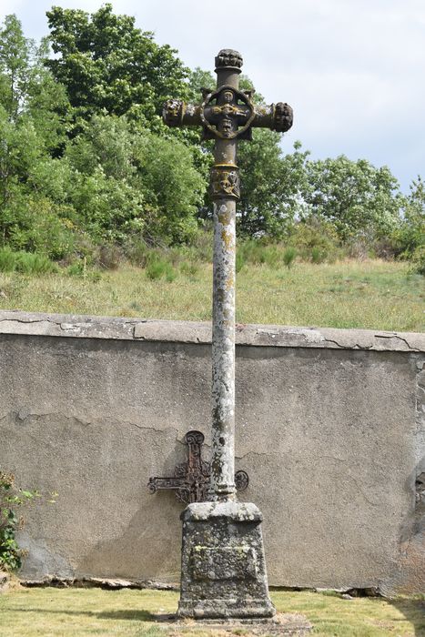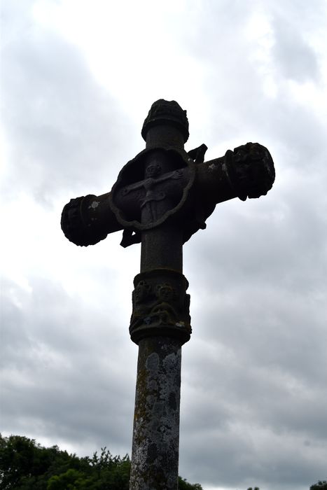 Les branches supérieures de cette croix du 16e siècle se terminent par des fleurons à feuillages. Sur l'une des faces, le Christ est encadré par un nimbe polylobé à quatre redents occupant les quatre angles formés par les bras. Le fût cylindrique est séparé de la tête par un bracelet cylindrique orné de figures.