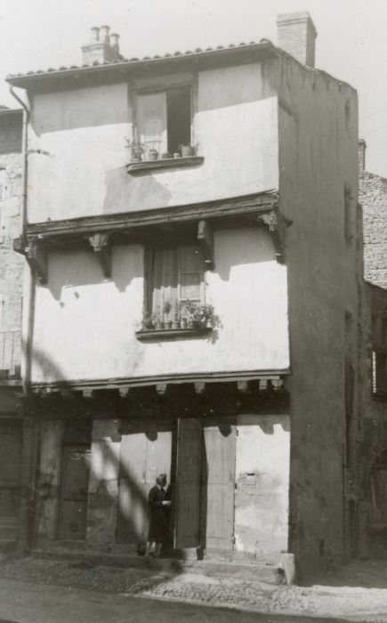 La façade sud de cette maison, qui s'ouvre au nord du chevet de l'église, possède deux étages en encorbellement, au-dessus d'un rez-de-chaussée comportant une porte et une grande baie modernes qui ont conservé leur linteau chanfreiné constitué d'une grosse poutre de bois. L'encorbellement du second étage est formé par une rangée de quatre consoles moulurées supportant une sablière horizontale moulurée. Chacun des deux étages comporte une fenêtre disposées dans le même axe et ayant conservé leur encadrement et leur appui saillant mouluré en bois. Les pans de bois sont recouverts d'un crépi.