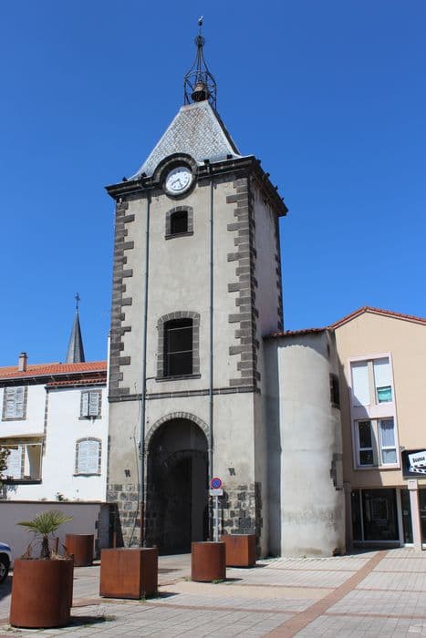 La commune était fortifiée en 1589. En 1686, ce lieu était encore entouré d'une enceinte de murs et de tours, protégée par des fossés. Rare vestige de ces fortifications qui ceinturaient la ville, cette ancienne porte sert aujourd'hui de beffroi. Elle a été transformée à l'époque classique (avant la fin du 17e siècle) et est surmontée d'un clocheton en fer forgé. Le tout, couronné par une sphère métallique, est surmonté par un paratonnerre.£La porte a été édifiée sur un plan rectangulaire. A l'est sont encore visibles les restes d'une tour ronde engagée. La porte elle-même est un passage voûté en plein cintre. Le côté nord est percé de fenêtres.