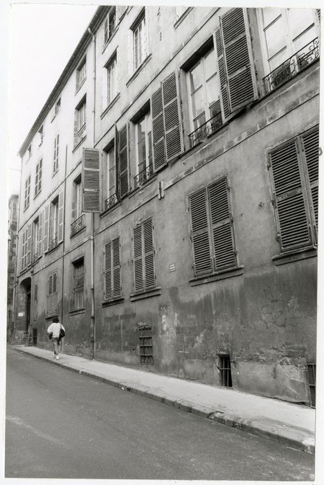 Immeuble du début du 18e siècle présentant, en rez-de-chaussée, un portail monumental encadré de pilastres, au linteau légèrement en forme d'arc surbaissé. Les boiseries comportent, outre deux lourds vantaux sculptés de plusieurs panneaux, un panneau supérieur fixe dont la base est soulignée par une moulure bombée sculptée de fleurons et de rinceaux. Au-dessus, la partie centrale est ornée d'une coquille que supporte une agrafe et qu'encadrent en la couronnant des branchages.